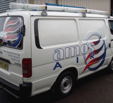 The Amos Air vans were done using digitally printed graphics and vinyl cut lettering, they had their own logos in place so it was just up to us to place them on the vans for maximum exposure.